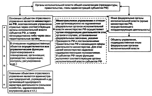 Для отраслевого управления характерны вертикальные правоотношения, т.е. отношения подчиненности или подведомственности, существующие между органами управления и объектами управления. Федеральное министерство возглавляет управление определенной сферой и действует через соответствующие органы исполнительной власти субъектов Федерации, а если имеет там свои территориальные органы, то непосредственно и через них. В сферу управления министерства, кроме названных органов, входят администрации предприятий, учреждений и организаций однородного характера деятельности, т.е. разрабатывающих и (или) производящих продукцию (выполняющих работы и оказывающих услуги) определенных видов однородного потребительского или функционального назначения (например, сельское хозяйство, здравоохранение и т.п.).