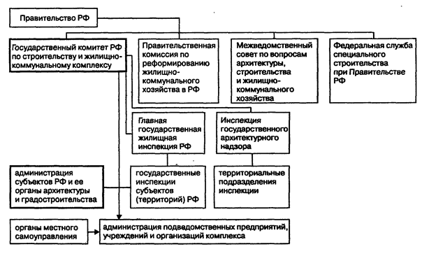 Особенностью управления строительно-жилищным комплексом является то, что на федеральном уровне оно осуществляется единым органом — Государственным комитетом РФ по строительству и жилищно-коммунальному комплексу. Он выполняет в основном функции координации и функционального регулирования деятельности, а другие вопросы управления в сфере строительства решают почти все федеральные органы отраслевой и межотраслевой компетенции. Что же касается управления жилищно-коммунальной сферой, то оно находится преимущественно в компетенции органов исполнительной власти субъектов Федерации и органов местного самоуправления.