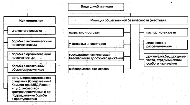 Милиция подразделяется на криминальную и общественной безопасности (см. схему 38).