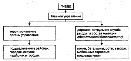 Государственная инспекция безопасности дорожного движения (ГИБДД России) действует на основании Положения о ней, утвержденного Указом Президента от 15 июня 1998 г. (см. схему 39). Она осуществляет специальные контрольные, надзорные и разрешительные функции в области обеспечения безопасности дорожного движения; обеспечивает соблюдение гражданами нормативных правовых актов по вопросам обеспечения безопасности дорожного движения, проведение мероприятий по предупреждению дорожно-транспортных происшествий и снижению тяжести их последствий в целях охраны жизни, здоровья и имущества граждан, защиты их прав и законных интересов, а также интересе общества и государства.