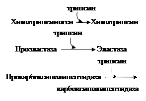 Подобный процесс с протеазами поджелудочного сока проходит в двенадцатиперстной кишке: за созревание трипсина отвечает энтерокиназа, а активированный энзим стимулирует химотрипсиноген, проэластазу, прокарбоксипептидазу.