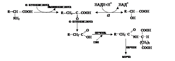 Если в клетке на данный момент гипоксия, при этом растет концентрация НАДН+Н+, чтобы не смещался рН, восстановленная форма НАД отдает свои водороды гомологам ПВК. Эта реакция (а) тупиковая - как только давление О2 приходит в норму, полученные соединения вновь окисляются в исходные вещества, которые в митохондриях подвергаются преобразованиям, сходным с окислительным декарбоксилированием пирувата. Большая часть получившихся при этом метаболитов циклических аминокислот токсична, поэтому они отправляются в печень для обезвреживания. Для этих целей обычно используется глутамин, который взаимодействуя с конечным соединением, инактивирует его, и последний током крови доставляется в почки выделяется в составе мочи (см. Приложение, табл. 5).