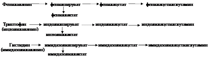 Несмотря на то, что на сходный способ распада циклических аминокислот приходится около 1%, он приобретает особое значение при генетической патологии, когда вследствие точечной мутации блокируется активность одного из физиологических ферментов и тогда накапливающийся субстрат подвергается преобразованиям, сходным с обычным распадом ПВК, но с образованием токсичных продуктов (Схема 2.2.1.3.1).