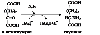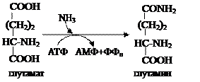 2) Во многих тканях (головном мозгу, печени, почках, мышцах) обезвреживание осуществляется путем синтеза глутамина (реже аспарагина) - нейтрального нетоксического вещества, способного диффундировать через мембраны (одна из форм транспорта NН3).