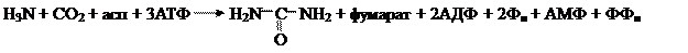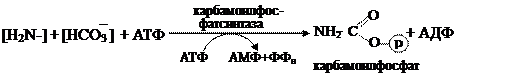 Мочевина – полный амид угольной кислоты, значит субстратами в ее образовании служат различные формы углекислоты (НСО3– или карбоксибиотин) и аммиака (амидная группа глутамина или соль аммония): Первая реакция:
