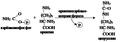 протекает в митохондриях, здесь карбамоилфосфат взаимодействует с орнитином, служащим своеобразным катализатором, вследствие чего данный процесс известен как орнитиновый цикл синтеза мочевины: