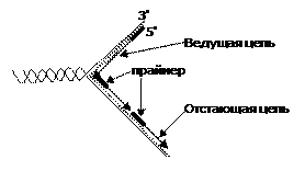 Параллельно с ростом цепи продолжается деспирализация и разделение цепей с помощью топоизомеразы и хеликазы, удлинение репликативной вилки. А так как процесс осуществляется лишь в одном (5' – 3') направлении, что позволяет происходить этому явлению непрерывно только на одной из матричных нитей. На антипараллельной синтез ограничивается сравнительно короткими фрагментами (100-1000 мононуклеотидов), названными по имени обнаружившего их ученого фрагментами Оказаки (с постоянным предварительным синтезом праймеров):
