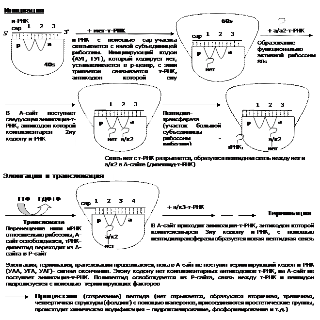 Малая субъединица (40S) имеет два специальных локуса: аминоацильный (А) и пептидильный (Р). Инициация (Схема 4.4.1) начинается с того, что к этой структуре подходит иРНК и своим кэп-участком так крепится к ней, что ее первый оказывается на Р-, а второй на А-локусе. Этот процесс осуществляется при обязательном участии факторов инициации (iF-1 – iF-3).