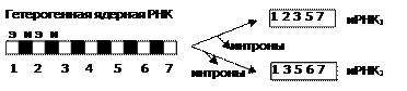Гетерогенная ядерная ДНК – предшественница иРНК может включать до нескольких десятков интронов и экзонов. При взаимодействии этого соединения с малыми ядерными РНК, интроны вычленяются, а вторые сшиваются, причем последние могут соединяться в разных последовательностях, что приводит к образованию разных иРНК, кодирующих разные белки. Это наблюдаемое для многих генов явление получило название альтернативного сплайсинга, а количество зрелых иРНК, отличных друг от друга, может приближаться к величине 2n, где n – число экзонов. Случаи подобного синтеза наблюдаются в мышечной, нервной тканях, при образовании белков клеточной адгезии.
