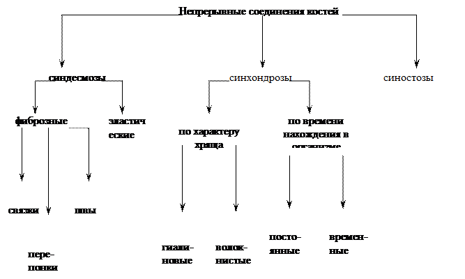 В зависимости от характера ткани, расположенной между соединяющимися костями, различают соединения с помощью собственно соединительной ткани (синдесмозы), хрящевой (синхондрозы) и костной (синостозы) (см. схему).