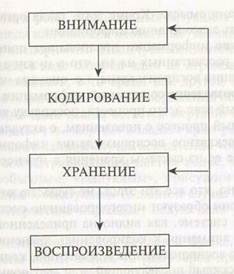 В этой системе, как видно на приведенной схеме, два «потока»: 1) от внимания к кодированию, хранению и воспроизведению; 2) от воспроизведения к хранению, кодированию и вниманию. Т.е. каждый последующий этап дает новый «виток» работы с информацией. Теперь необходимо рассмотреть, что же «происходит» с социальной информацией на каждом этапе, в частности, какие специфичные для социальной информации искажения могут возникать на каждом этапе.