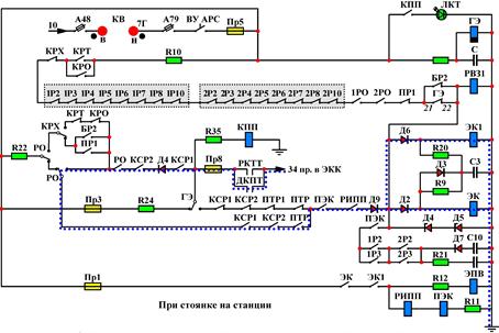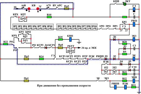 При работе на линии, когда АРС не фиксирует превышения скорости и реле КСР включены, то при скорости более 10 км/ч катушки ЭК и ЭК1 получают питание по пятой цепи.