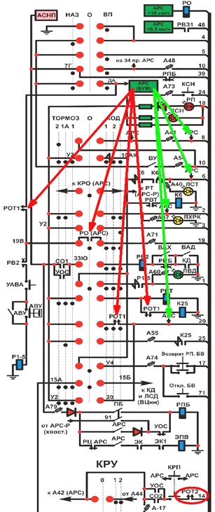 - Размыкаются контакты РОТ2 в цепи 14 поездного провода, что приводит к разбору схемы с ходового режима при управлении поездом от КРУ.
