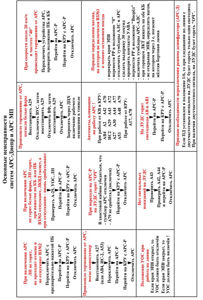 А17 - белые фары и контроль дверей при управлении от КРУ. При невозможности восстановить А29 или А17 рекомендуется отключить ВУС или ВФ, восстановить автоматик и запросить через ДЦХ включение освещения в тоннеле. Если А29 или А17 выбивает вновь, то необходимо отключить систему АРС.