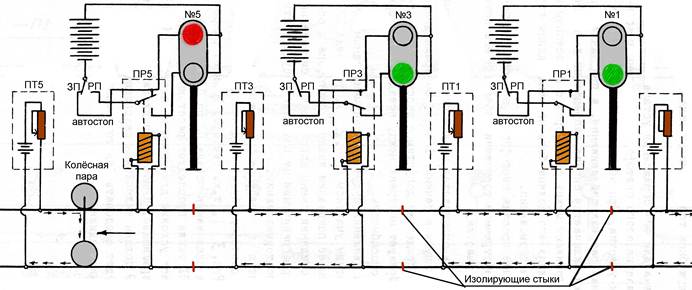При занятом блок-участке колёсная пара находится между путевым трансформатором и путевым реле. Так как колёсная пара обладает значительно меньшим сопротивлением, чем путевое реле, то реле оказывается зашунтированым колёсной парой и ток по нему не проходит. При этом замыкаются контакты путевого реле в цепи привода автостопа и он принимает заграждающее положение, тем самым замыкая цепь для запрещающего сигнала светофора. Другая пара контактов путевого реле посылает сигнал о занятости блок-участка на шифратор.