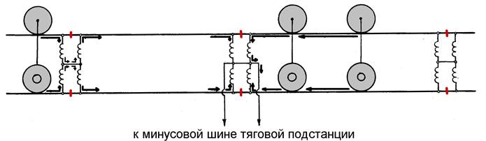 По рельсовой цепи протекают сразу 3 вида токов: обратный тяговый ток, ток частотой 50 Гц для питания путевого реле и переменный сигнальный ток от ГАЛС. Чтобы обеспечить непрерывный отвод тягового тока (на «минус» тяговой подстанции), все изолирующие стыки шунтируются путевыми дроссель-трансформаторами, которые не пропускают переменный ток, но имеют очень малое сопротивление постоянному току. На конце рельсовой цепи обратный тяговый ток попадает из каждой нити через полуобмотку дроссель-трансформатора на среднюю точку, далее по кабелю ток попадает опять на среднюю точку уже смежного дроссель-трансформатора, далее разделяется по его полуобмоткам и перетекает в каждую нить следующей рельсовой цепи (см. рис. ниже).