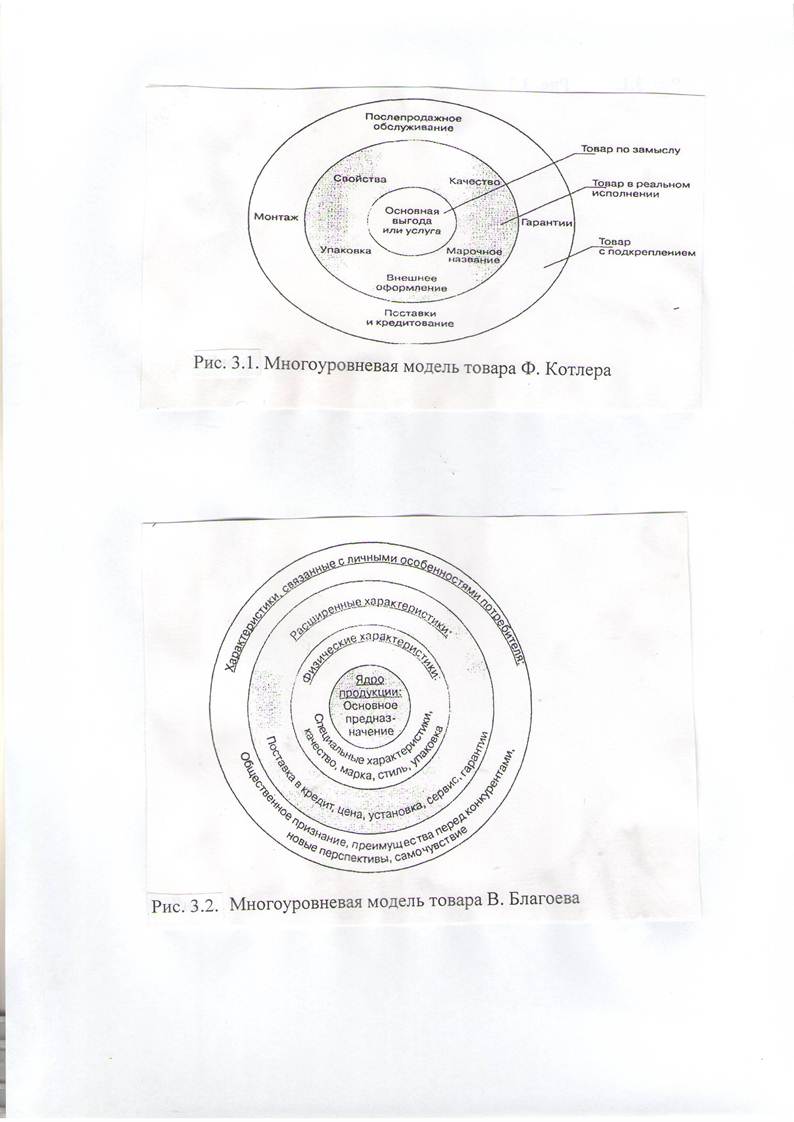 Классической моделью считается трехуровневая модель Филиппа Котлера. Основная выгода соответствует первому уровню товара и является «товаром по замыслу». На этом уровне, по мнению Ф Котлера, «задача состоит в том, что выявить скрытые нужды потребителя, которые должны удовлетворяться товаром». Второй уровень определяет набор полезных, сточки зрения потребителей, характеристик. Третий уровень отражает возможности удовлетворения более широкого круга потребностей потребителей, связанных с данным товаром (рис 3.1). Второй подход показан на примере модели товара В. Благоева, который предполагает группировку характеристик товара на четырёх уровнях (рис. 3.2).