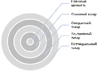 Переход на новый уровень означает увеличение ценности товара для потребителей; а все вместе они образуют иерархию ценности для потребителей. В основе ее лежит стержневая выгода — та основная услуга, или преимущество, которую приобретает покупатель. Второй уровень товара основывается на его стержневой выгоде и называется основным (базовым) товаром. Третий уровень — это ожидаемый товар, т. е. подготовленный производителем набор свойств и условий, которые потребитель ожидает получить при покупке. На четвертом уровне формируется дополненный (улучшенный) товар, который превышает обычные ожидания потребителя.