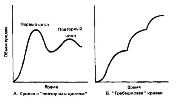 Одним из часто встречающихся вариантов является кривая «с повторным циклом» (см. рис. 3. 2а). Второй «горб» сбыта вызывается мероприятиями по стимулированию сбыта, проведенными на этапе упадка товара.
