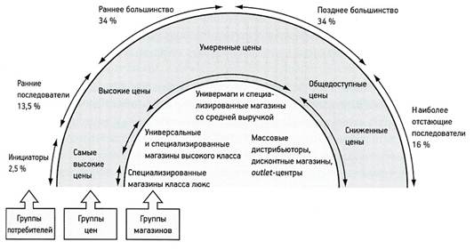 Сегодня стадия внедрения всё более переплетается с дизайном товара и процессами его разработки, которые объединяют в себе непрерывную информацию о рынке и обратную связь с потребителем. Изначально стиль принимается новаторами моды. За ними следуют лидеры мнений и ранние конформисты, которые способствуют росту популярности стиля. На этапе зрелости стиль широко принимается потребителями массового рынка, а в начале стадии заката – поздними сторонниками моды. Наконец, «изолированные от моды люди» и/или её наиболее отстающие последователи принимают стиль на стадии, когда он уже устарел. Эти группы потребителей ассоциируются с определённым уровнем доходов, социальным статусом и образом жизни, что отражено на рисунке соответствующими уровнями цен и группами магазинов.