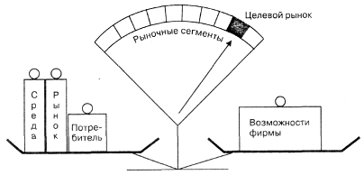 После оценки объёма продаж каждого товара на рынке, необходимо выполнить прогноз. Необходимо решить вопрос о том, как именно фирма будет выходить на рынок (рис. 4.1). Рынок состоит из множества типов потребителей, множества товаров, множества нужд. Группы потребителей могут формироваться по географическим признакам (пол, возраст, уровень доходов, уровень образования), социографическим признакам (принадлежность к общественному классу, образ жизни) и поведенческим признакам (поводы для покупок, искомые выгоды, интенсивность потребления) [16].
