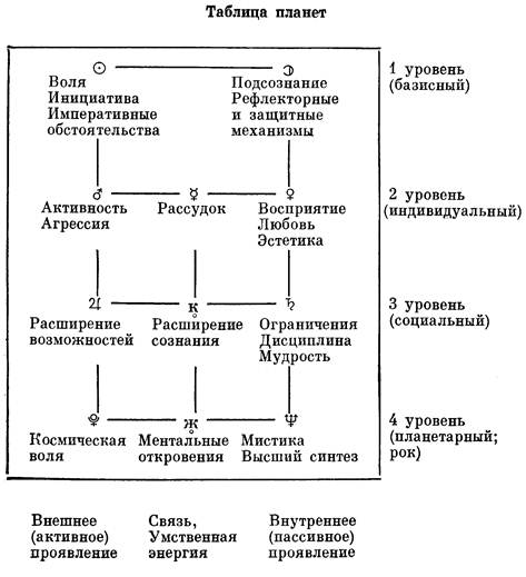 Планеты третьего и четвертого уровней соответствуют трансперсональному уровню "я". Третьему уровню соответствуют те слои подсознания, которые прямо связывают человека с его социальным слоем и социальным (кастовым) подсознанием. А планетам четвертого уровня соотвествует связь с ноосферой, что означает выход на большой трансперсональный уровень, то есть на те слои подсознания, где человек уже воспринимает всю культуру человечества, все знания, им накопленные.