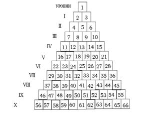 В данном случае в качестве структуры возникла Пирамида чисел (рис 3.1), в которой числа расположены по уровням, причем на каждом следующем уровне чисел на единичку больше, чем на предыдущем. Я написал интерпретации чисел до 10-го уровня включительно, то есть до числа 66, а дальше почувствовал, что по разным причинам пора остановиться.