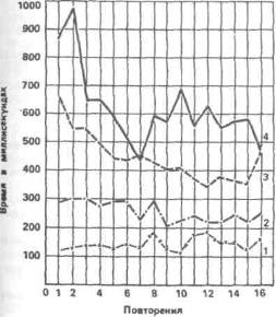Рис. V.10. Изменение скорости сенсомотор-Ной реакции при упражнении: 1 — простая ре-*кция; 2 — простая реакция с переносом паль-Ца с одной точки на другую; 3 — реакция выбора; 4 — реакция переключения