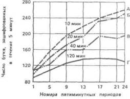Рис. V.11. Зависимость результатов упражнений от распределения их во времени (данные Старка). Испытуемым предлагалось упражняться в замещении букв цифрами в течение 120 минут со следующим распределением упражнений во времени: группа А упражнялась в течение 6 дней по два раза в день, по 10 минут каждый раз, группа Б — 6 дней по одному разу в день (в течение 20 минут каждый раз), группа В — 3 дня по 40 минут через день, группа Г выполнила одно упражнение, продолжавшееся 120 минут без перерыва. Как видно из кривых, упражнения по 10 и 20 минут дали наибольшее повышение скорости работы.