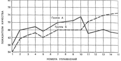 Результаты выработки навыков с оценкой и без оценки в экспериментальных и контрольных группах изображены на данном графике. Смена групп, упражняющихся с оценкой и без оценки результата, произведена после 10-го упражнения