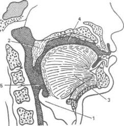 Рис. VI.2. Схема расположения органов речи человека: 1 — надгортанник, 2 —- нёбная занавеска, 3 —- язык, 4 —ротовая полость, 5 -глоточная трубка