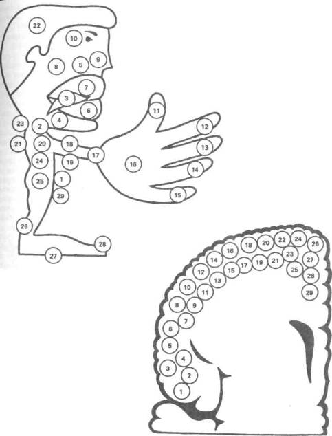 Рис. VIII.4. Схема представительства анализаторов в коре