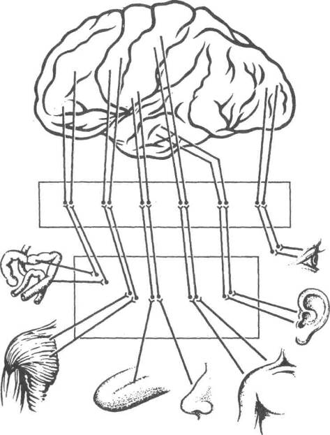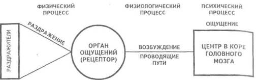В основе любого психического процесса, в том числе и ощущения, лежат физиологические нервные процессы возбуждения и торможения, протекающие в больших полушариях мозга. Предметы, воздействуя своими физическими свойствами на органы чувств, вызывают в окончаниях чувствительных нервов соответствующего воспринимающего органа — рецептора — нервный процесс возбуждения. Возбуждение передается по проводящим нервным путям в мозг, где в специальных клетках, составляющих корковую часть анализатора, физиологический процесс превращается в психический процесс — ощущение. Человек осознает, что то, что на него воздействует, отражает качества предметов и явлений, ощущает цвета, звуки, тепло, холод, запахи. Вместе с тем воздействия внешней или внутренней среды на периферическую часть анализатора вызывают ответную реакцию: зрачок расширяется или сужается, человек направляет взгляд на предмет, вызвавший ощущение, прислушивается, отдергивает руку от горячего и т.д. От действующего органа (глаза, уха, руки) в кору головного мозга поступает обратный сигнал о деятельности рецептора.