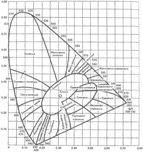 Все цветовые тона, включая нейтральные (серые), могут быть получены с помощью смешения трех основных цветов — красного, синего и зеленого. Для описания цветов на практике пользуются цветовым телом, сечение которого представляет треугольник с вершинами, соответствующими трем основным цветам. Условные коэффициенты на осях X и У определяют координаты каждого цвета.