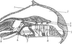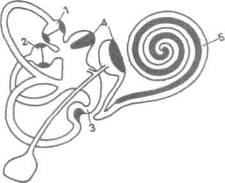 Рис. VIII.15. Положение лабиринта во внутреннем ухе: 1—3— перепончатые ампулы; 4 — мешочек; 5 — улитка