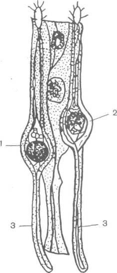 Рис. VIII. 19. Строение обонятельного эпителия: 1—2 — тела обонятельных клеток с наружными члениками; 3 — отростки клеток, по которым возбуждение идет к центру