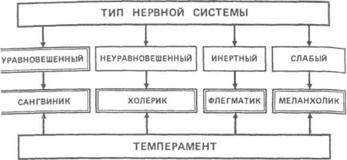 Рис. XIII.2. Схема зависимости темперамента от координат типа нервной системы. Координаты ассматриваются как основные характеристики в соотношении ВНД и темперамента