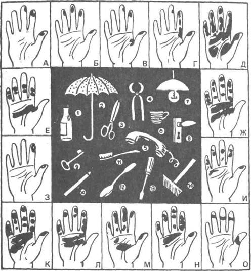 Отпечатки на руке. На каждой из Определите, какой предмет держа-