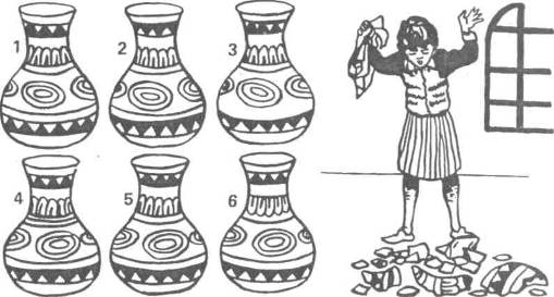 Жалко вазу! Хозяйка вытирала вазу (рис. 5), сделала неловкое движение и выронила ее. Попытайтесь по черепкам определить, какая из шести представленных на рисунке ваз разбилась.