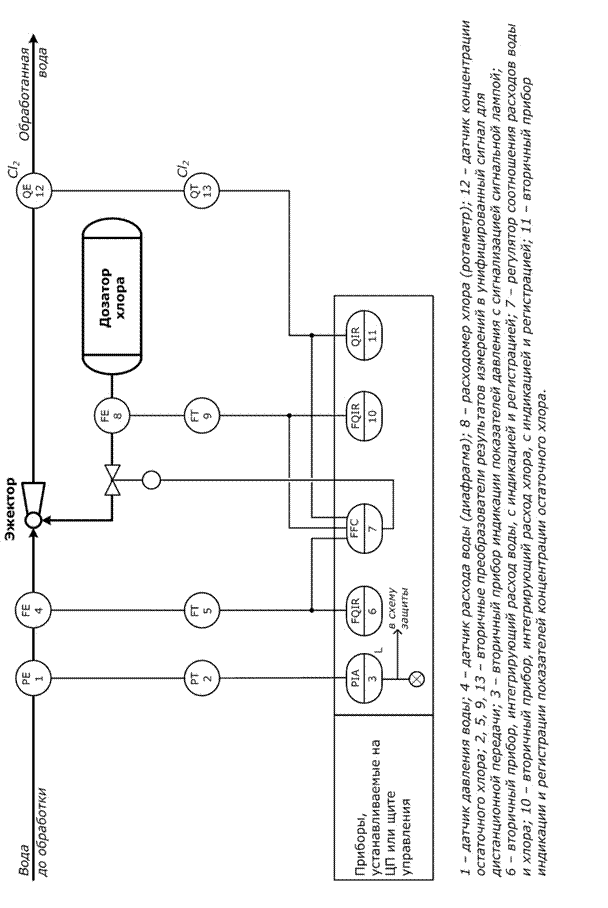 Рассмотрим пример следящей САУ, реализующей комбинированное управление, на примере схемы автоматизации хлорирования воды (рис. 20). Целью управления является регулирование подачи хлора (ведомый параметр) в зависимости от изменяющегося расхода поступающей на хлорирование воды (ведущий параметр). Заданное соотношение расходов обеспечивается регулятором 7, который изменяет положение регулирующего клапана, установленного на линии подачи хлора из дозатора в эжектор. Признаком реализации рассматриваемой САУ по комбинированному варианту является использование в контуре управления контроля возмущения – измерения концентрации остаточного хлора в обработанной воде. Доза подаваемого хлора, определенная соотношением расходов, корректируется регулятором 7 в зависимости от остаточной концентрации.
