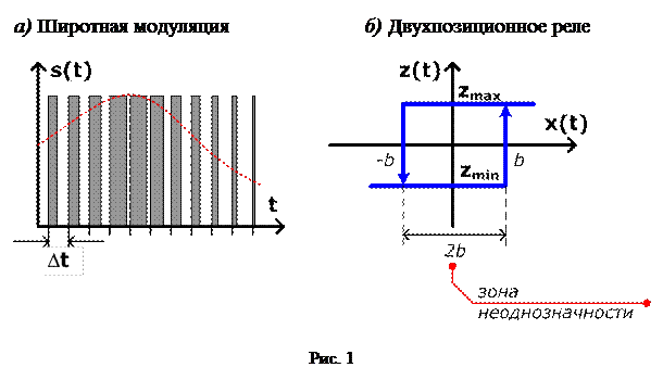 В релейных САУ управляющее воздействие формируется с использованием релейных регуляторов, у которых при непрерывном изменении входной величины регулирующий орган занимает ограниченное число положений. На рис. 23– б приведена характеристика двухпозиционного регулятора с зоной неоднозначности, у которого в зависимости от величины непрерывно изменяющегося задающего воздействия x (t) регулирующий орган занимает одно из двух возможных положений, определяемых двумя значениями управляющего воздействия – zmax и zmin. У такого регулятора, в зависимости от знака и величины задающего воздействия, регулирующий орган или полностью открыт (приток вещества или энергии максимальный), или полностью закрыт (приток вещества или энергии равен нулю). Примерами двухпозиционных устройств являются электроконтактный термометр, пневматическое реле и т.п.
