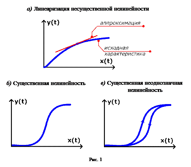 Строго говоря, все практически реализуемые системы являются нелинейными. Однако, во многих случаях нелинейность рабочей характеристики системы является несущественной, и система может рассматриваться как линейная. Пример несущественно нелинейной характеристики САУ с линейной аппроксимацией в ограниченной области рабочей точки показана на рис. 24– а.