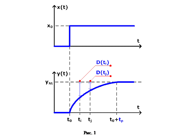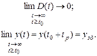 Как уже отмечалось, инерционность ТСА и ОУ обычно существенно больше, чем у источников задающих воздействий, поэтому, после изменения задающего воздействия, которое можно приближенно считать близким к идеальной ступеньке, новое установившееся значение управляемой величины y (t) достигается плавно, за время переходного процесса tp. За это же время динамическая ошибка управления D (t), имеющая максимальное значение в момент времени t 0, убывает до конечного постоянного значения Dст, определяемого величиной действующего возмущения(см. рис. 25):