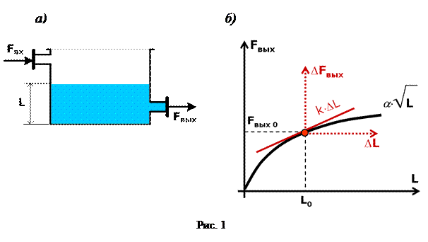 Геометрически линеаризация является заменой реальной нелинейной характеристики звена САУ или САУ в целом на линейную. Рассмотрим линеаризацию характеристики звена САУ на примере проточного бака со свободным истечением жидкости (рис. 29– а), где Fвх – объемный расход поступающей в бак жидкости (приток); Fвых – объемный расход жидкости на выходе из бака (сток); L – уровень жидкости в баке.