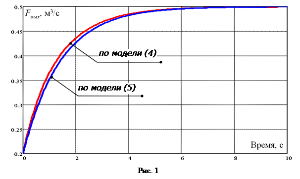 Пусть в момент времени t 0 расход притока скачком возрастает до величины 0,5 м3/с. Численное решение в заданных условиях уравнений (4) и (5) относительно Fвых (t) позволяет получить график изменения Fвых (t) с момента времени t 0 и до момента восстановления равновесия, т.е. до момента времени, когда значение стока сравняется с новым значением притока: