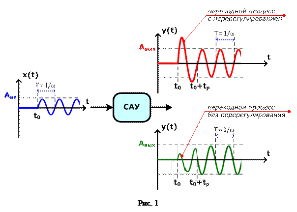 Пример работы САУ при подаче гармонического воздействия показан на рис. 34. С момента времени t 0 задающее воздействие САУ x (t) начинает изменяться по гармоническому закону, что вызывает переход системы в режим переходного процесса, за время которого амплитуда колебаний y (t) плавно возрастает, пока не достигнет конечного постоянного (стационарного) значения Авых. С этого момента система работает в стационарном режиме колебаний.