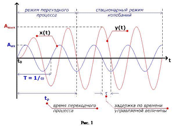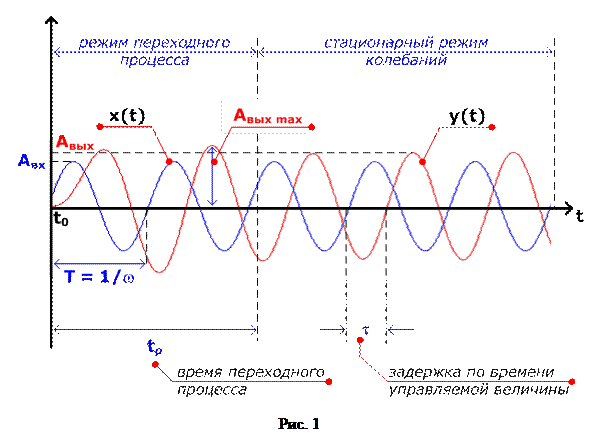 Наличие сдвига фазы выходного гармонического сигнала относительно входного объясняется инерционностью САУ. По сути, сдвиг фазы является временной задержкой выходного сигнала, обусловленной конечной длительностью переходного процесса. Однако, поскольку эта величина является аргументом функции синуса, она должна выражаться в радианах или градусах, а не в единицах измерения времени. При этом величину задержки по времени выходного сигнала относительно входного t можно рассчитать с учетом того, что фаза гармонического сигнала за время периода изменяется на 360°: