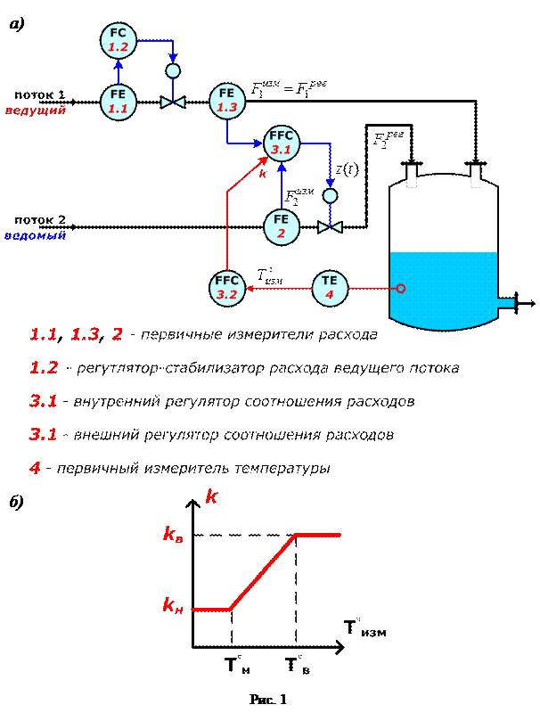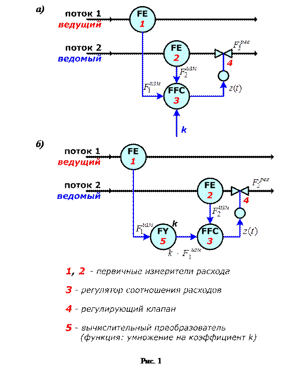 1) с применением следящего управления для обеспечения постоянного заданного соотношения «ведущего» и «ведомого» расходов;