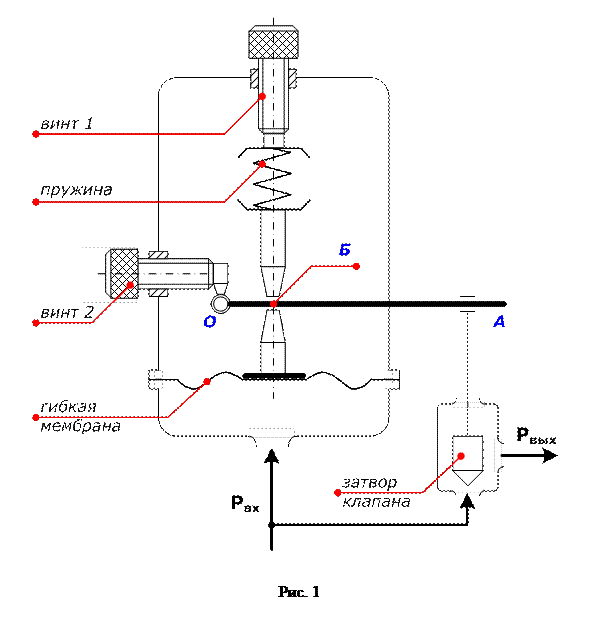 С увеличением входного давления гибкая мембрана (см. рис. 44) прогибается и точка Б рычага ОА, преодолевая силу упругости сжатой пружины, перемещается вверх. Точка А, вращаясь относительно центра О, открывает клапан. Винтом 2 настраивается чувствительность регулятора (при смещении оси вращения, т.е. точки О вправо – возрастает). Начало открытия клапана настраивается натяжением пружины 3 с помощью винта 4. Вследствие инерции движущихся частей и пружины переходной процесс П-регулятора давления (перемещение затвора клапана) имеет колебательную форму. При повышении чувствительности настройкой или использованием более мягкой пружины в переходном процессе возникают долго не затухающие колебания с большими значениями динамической ошибки регулирования в начале переходного процесса.