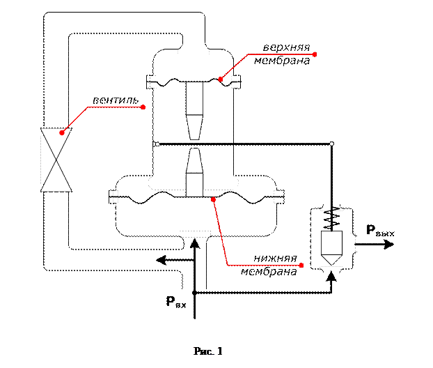 Пример реализации пропорционального-дифференциального регулятора давления приведен на рис. 45 (органы настройки регулятора условно не показаны). При медленном изменении входного давления нижняя и верхняя мембраны прогибаются почти одновременно, но поскольку площадь нижней мембраны больше, то суммарная сила давления направлена вверх и перемещение затвора клапана пропорционально силе давления. При быстром повышении входного давления в первый момент времени прогибается только нижняя мембрана, т.к. через малое отверстие вентиля газ не успевает пройти и воздействовать на верхнюю мембрану. Поэтому клапан в начальный момент времени резко открывается, и только потом, в процессе выравнивания давления, положение затвора становиться пропорциональным давлению. Т.о. регулятор не только на величину отклонения давления от заданного значения, но и на скорость изменения этого отклонения. В установившемся состоянии эта скорость равна нулю, и данные регулятор не отличается от пропорционального (статические характеристики у них одинаковые).